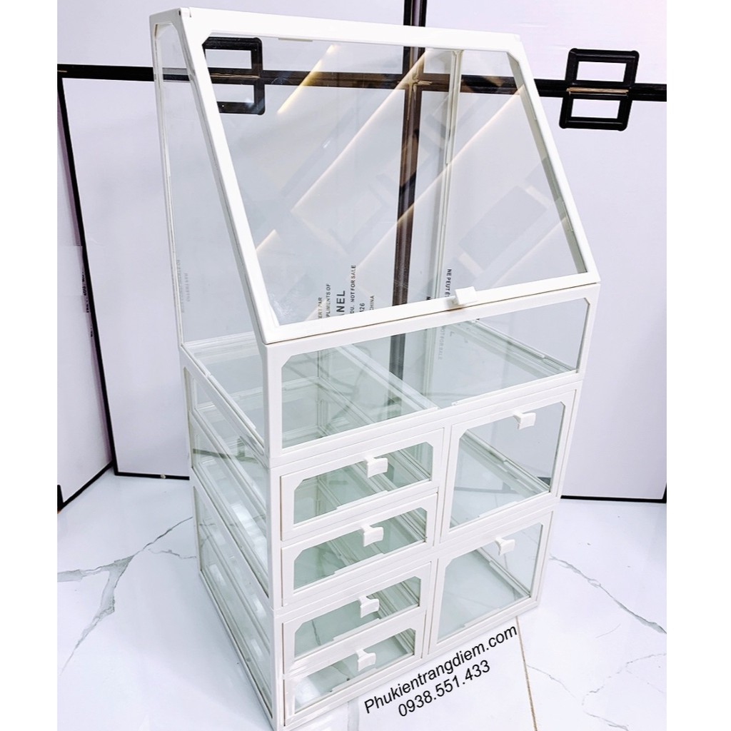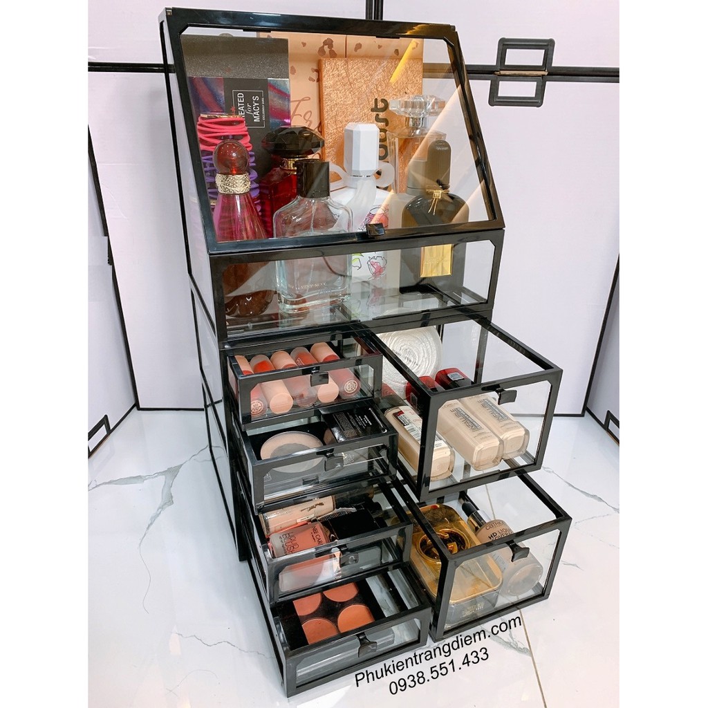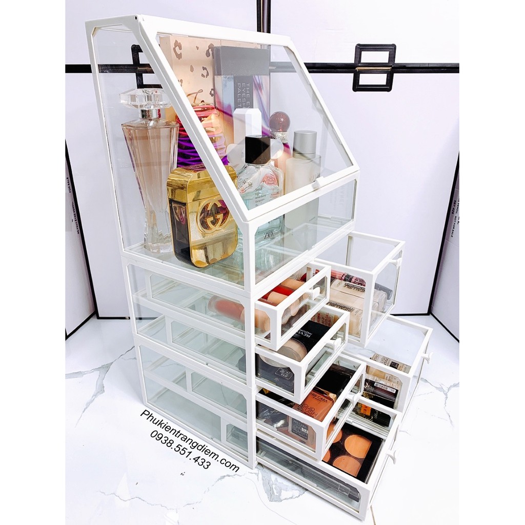 - Bộ khay kệ trang điểm cao cấp trong suốt gồm 3 phần: phần khay có nắp đậy trên cùng, phần ngăn kéo nhỏ ở giữa và phần ngăn kéo lớn dưới đáy. Giúp sắp xếp thật gọn số lượng lớn các vật dụng trang điểm vào bên trong.