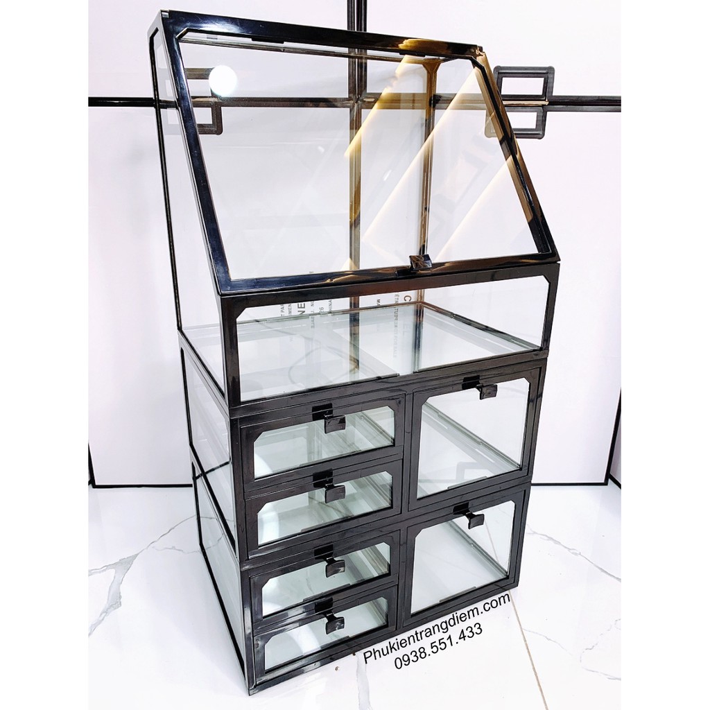 - Bộ Hộp Kệ Trang Điểm sang trọng được làm bằng chất liệu Kính cứng trong suốt bọc viền đen hoặc trắng rất đẹp mắt, sang trọng và chắc chắn.