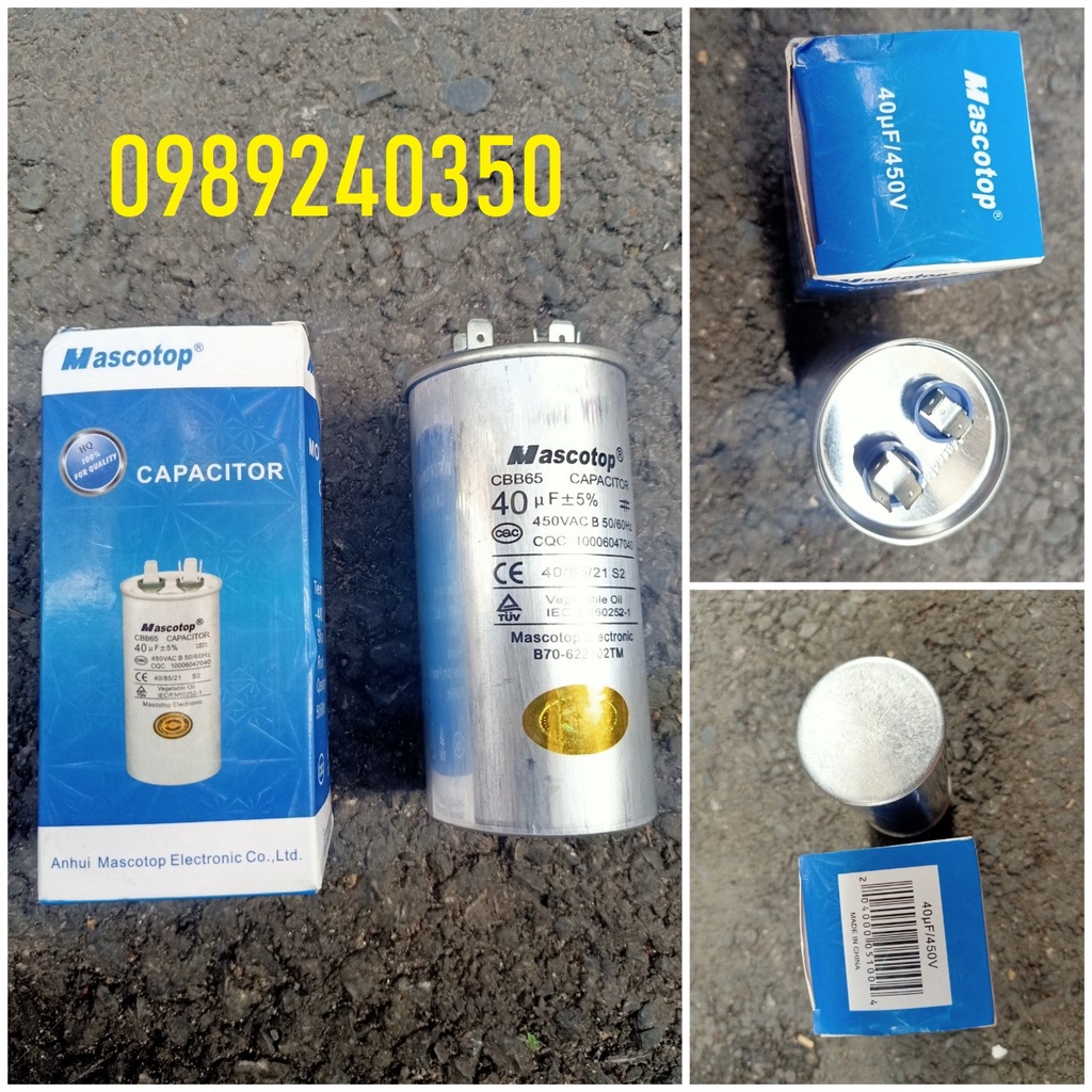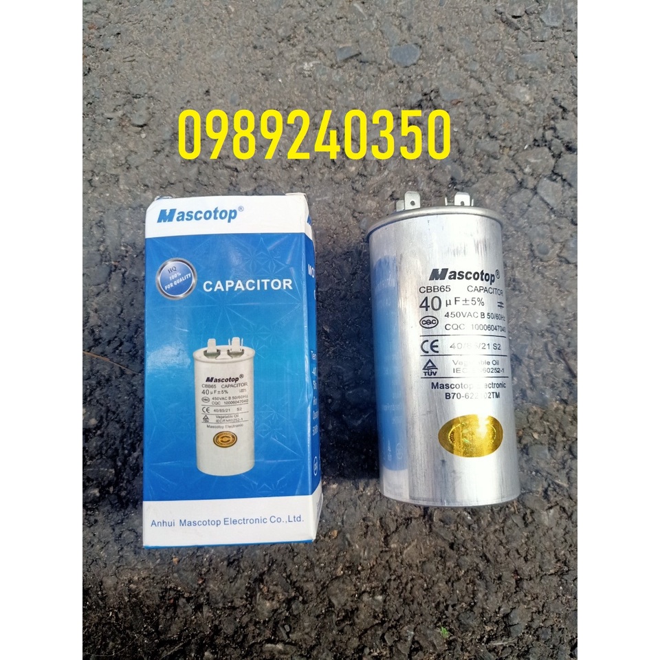Tụ khởi động lốc điều hoà 40 uf 2 chân (loại tốt)Tụ điện Mascotop đã đạt nhiều tiêu chuẩn quốc tế: CQC, UL, CE, TUV, VDE, CSA, ISO9001 và ISO14001 kèm theo nhiều giải thưởng chứng nhận quốc gia. Được nhiều thị trường lớn, nổi tiếng khắt khe chấp nhận: Châu Âu, Bắc Mỹ, Trung Đông, Úc, Nga,….