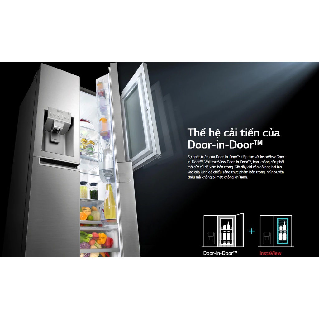 Thiết kế InstaView Door-in-Door™InstaView Door-in-Door™ có tấm kính gương tuyệt đẹp và bật sáng - trong suốt khi gõ nhanh hai lần, cho phép bạn nhìn xuyên thấu bên trong mà không phải mở cửa tủ, giảm thiểu sự thất thoát khí lạnh - cho rau củ tươi ngon lâu hơn.