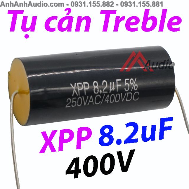 Tụ Cản Treble XPP 8.2 uF 400V dùng gắn loa Treble , phân tần loaTụ cản Treble XPP 8.2 dùng cản treble , chống cháy treble do tụ thường cản không hết âm bass , trị số chính xác cao độ bền cao , chất âm chi tiết tách bạch