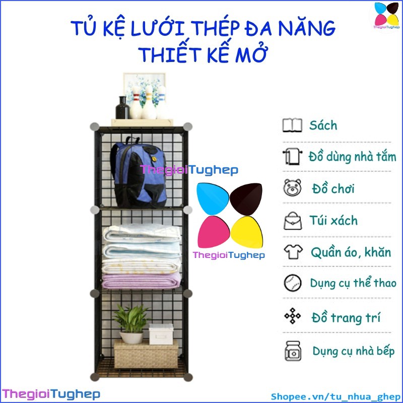 Tủ lưới sắt lắp ghép đa năng hiện đại để sách, đồ dùng trang trí phòng làm việc 3 ôTỦ KỆ LƯỚI THÉP ĐA NĂNG: được làm từ các tấm lưới thép, mỗi ô của tủ 3 ngăn này có thể chứa được 20kg, cho phép bạn có thể đựng sách, giấy tờ, tài liệu, quần áo, chăn, khăn tắm, đồ chơi, túi xách, phụ kiện v.v