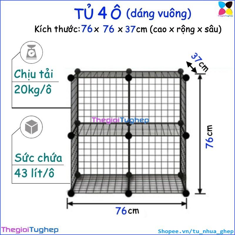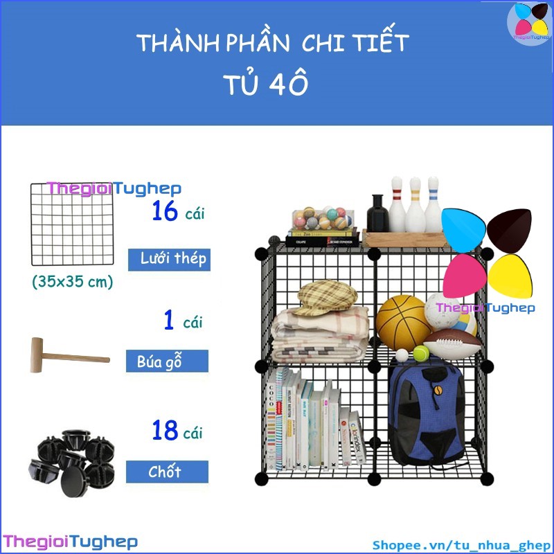 Tủ lưới sắt lắp ghép đa năng hiện đại để sách, đồ dùng trang trí phòng làm việc 4 ô lắp hình vuôngTỦ KỆ LƯỚI THÉP ĐA NĂNG: được làm từ các tấm lưới thép, mỗi ô của tủ 4 ngăn này có thể chứa được 20kg, cho phép bạn có thể đựng sách, giấy tờ, tài liệu, quần áo, chăn, khăn tắm, đồ chơi, túi xách, phụ kiện v.v