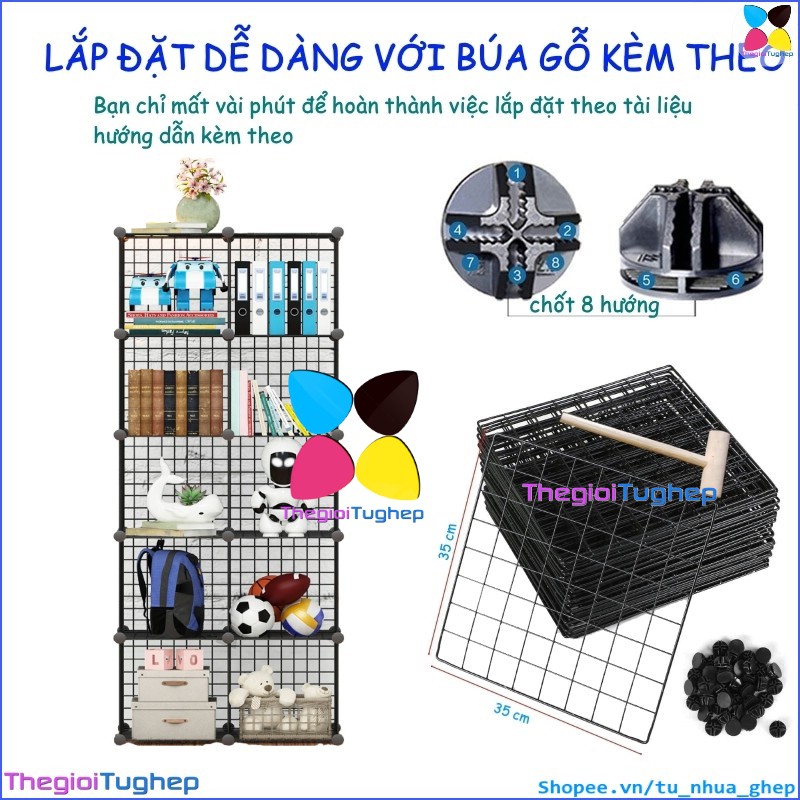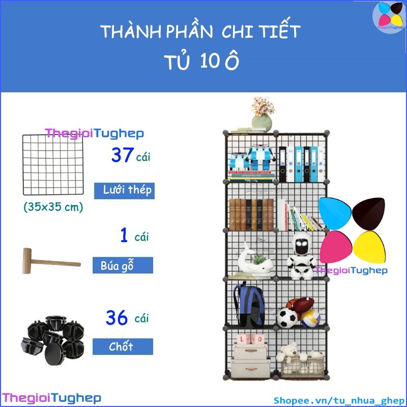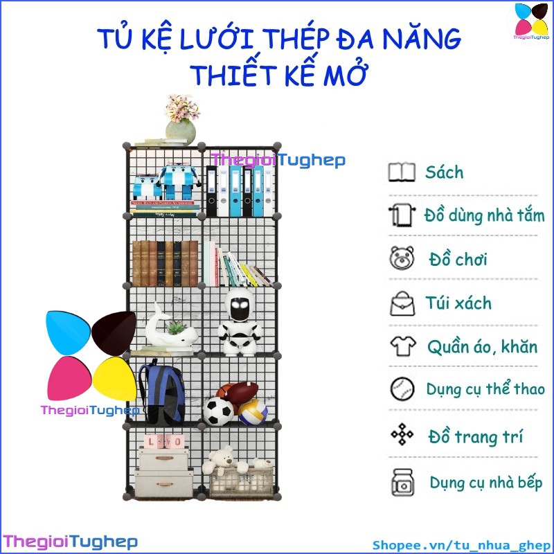 Tủ lưới sắt lắp ghép đa năng hiện đại để sách, đồ dùng trang trí phòng làm việc 10 ôTỦ KỆ LƯỚI THÉP ĐA NĂNG: được làm từ các tấm lưới thép, mỗi ô của tủ 10 ngăn này có thể chứa được 20kg, cho phép bạn có thể đựng sách, giấy tờ, tài liệu, quần áo, chăn, khăn tắm, đồ chơi, túi xách, phụ kiện v.v