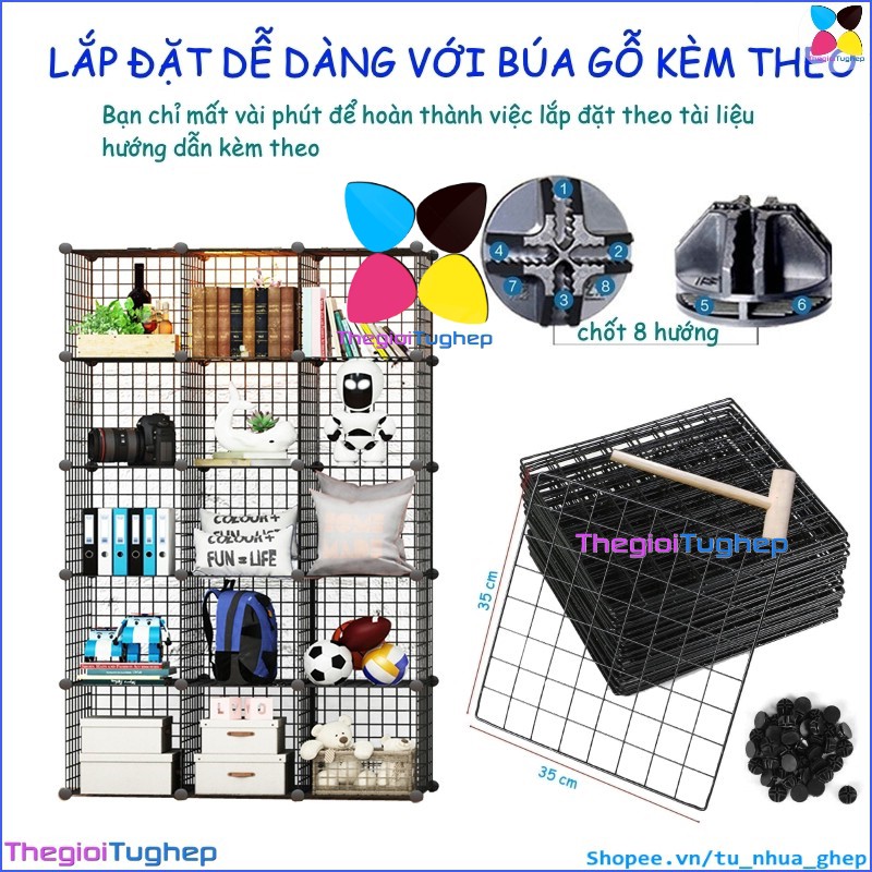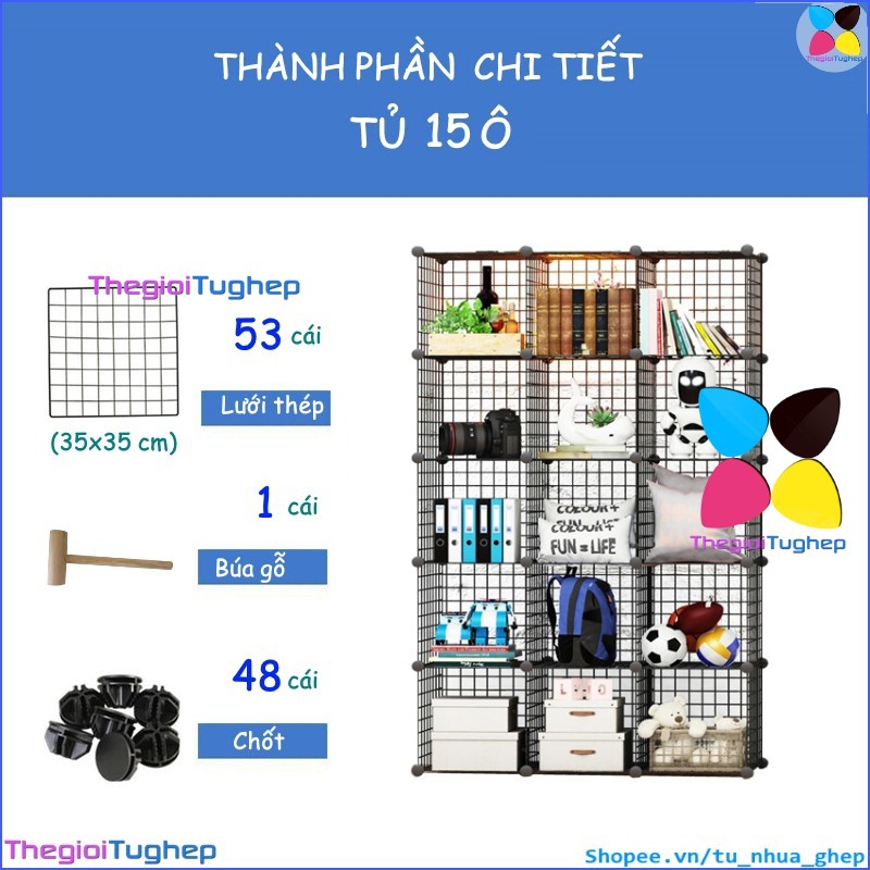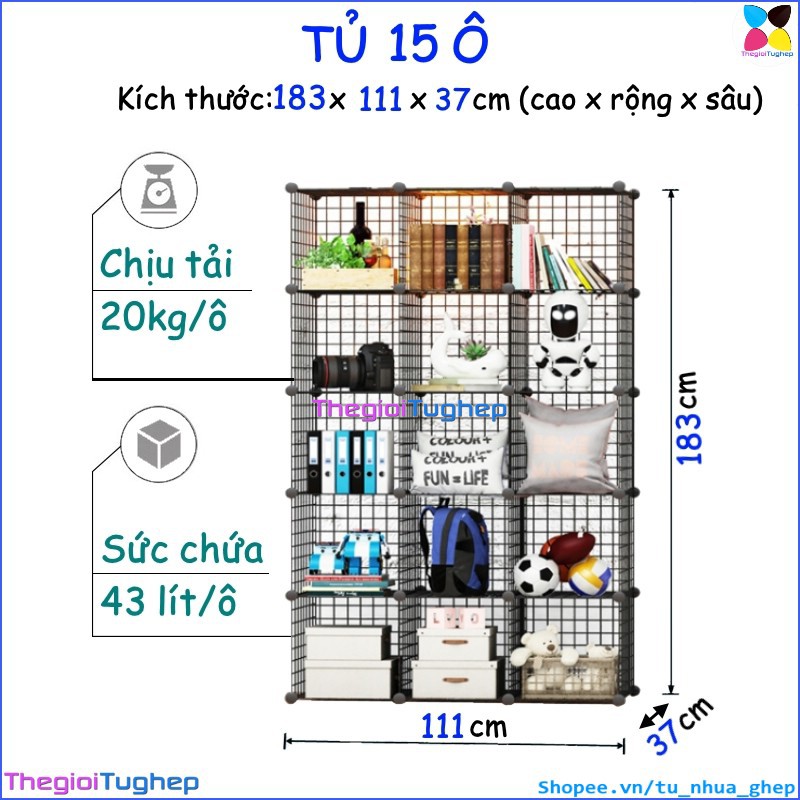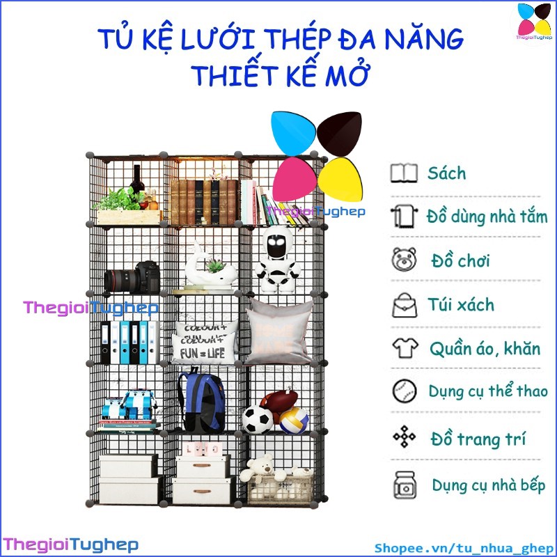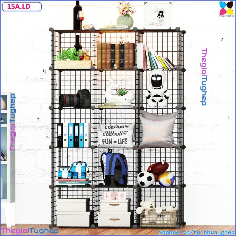 Tủ lưới sắt lắp ghép đa năng hiện đại để sách, đồ dùng trang trí phòng làm việc 15 ôTỦ KỆ LƯỚI THÉP ĐA NĂNG: được làm từ các tấm lưới thép, mỗi ô của tủ 15 ngăn này có thể chứa được 20kg, cho phép bạn có thể đựng sách, giấy tờ, tài liệu, quần áo, chăn, khăn tắm, đồ chơi, túi xách, phụ kiện v.v