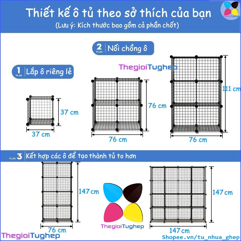 Kích thước 1 ô sau khi lắp: 37x37x37 cm (tính cả chốt)