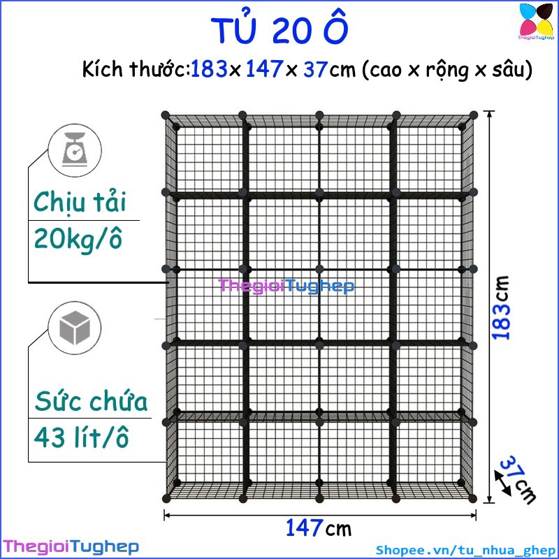 Tủ lưới sắt lắp ghép đa năng hiện đại để sách, đồ dùng trang trí phòng làm việc 20 ôTỦ KỆ LƯỚI THÉP ĐA NĂNG: được làm từ các tấm lưới thép, mỗi ô của tủ 20 ngăn này có thể chứa được 20kg, cho phép bạn có thể đựng sách, giấy tờ, tài liệu, quần áo, chăn, khăn tắm, đồ chơi, túi xách, phụ kiện v.v