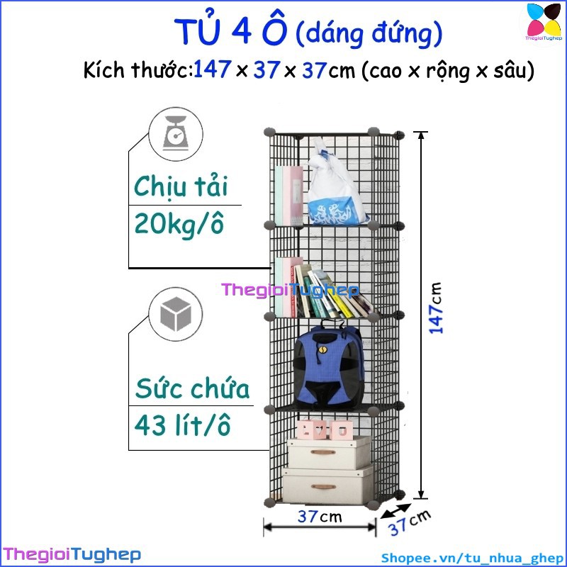 Tủ lưới sắt lắp ghép đa năng hiện đại để sách, đồ dùng trang trí phòng làm việc 4 ô (lắp đứng)TỦ KỆ LƯỚI THÉP ĐA NĂNG: được làm từ các tấm lưới thép, mỗi ô của tủ 4 ngăn này có thể chứa được 20kg, cho phép bạn có thể đựng sách, giấy tờ, tài liệu, quần áo, chăn, khăn tắm, đồ chơi, túi xách, phụ kiện v.v