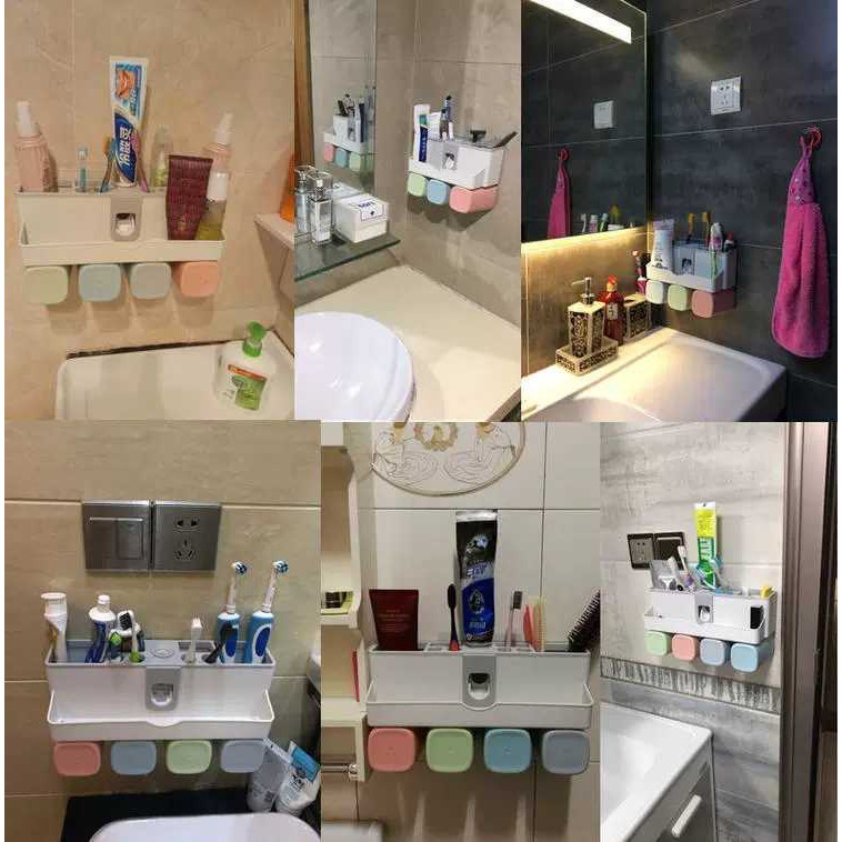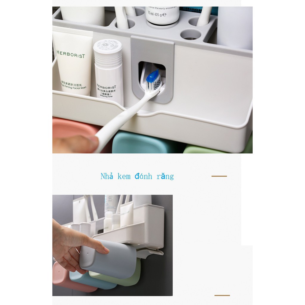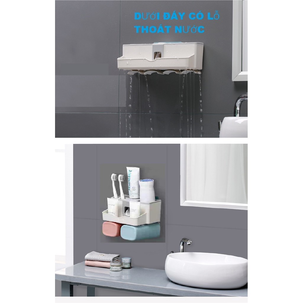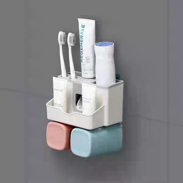 Bộ tự nhả kem đánh răng 2 cốc thông minh, có giá để đồ dùng, dụng cụ rủa mặt, vệ sinh cá nhân, tiện lợi cho nhà tắm