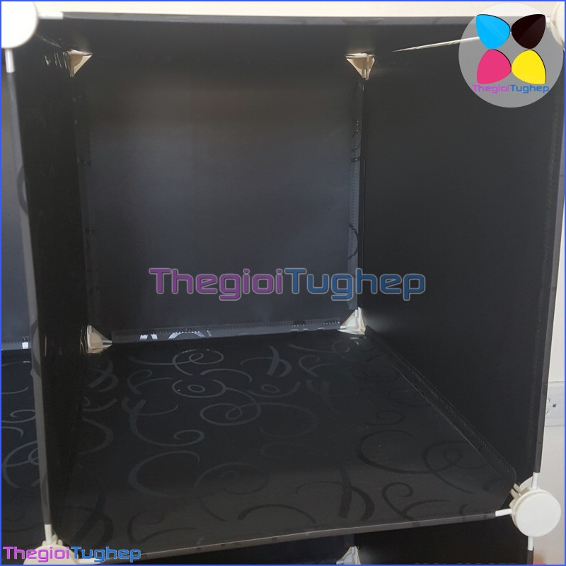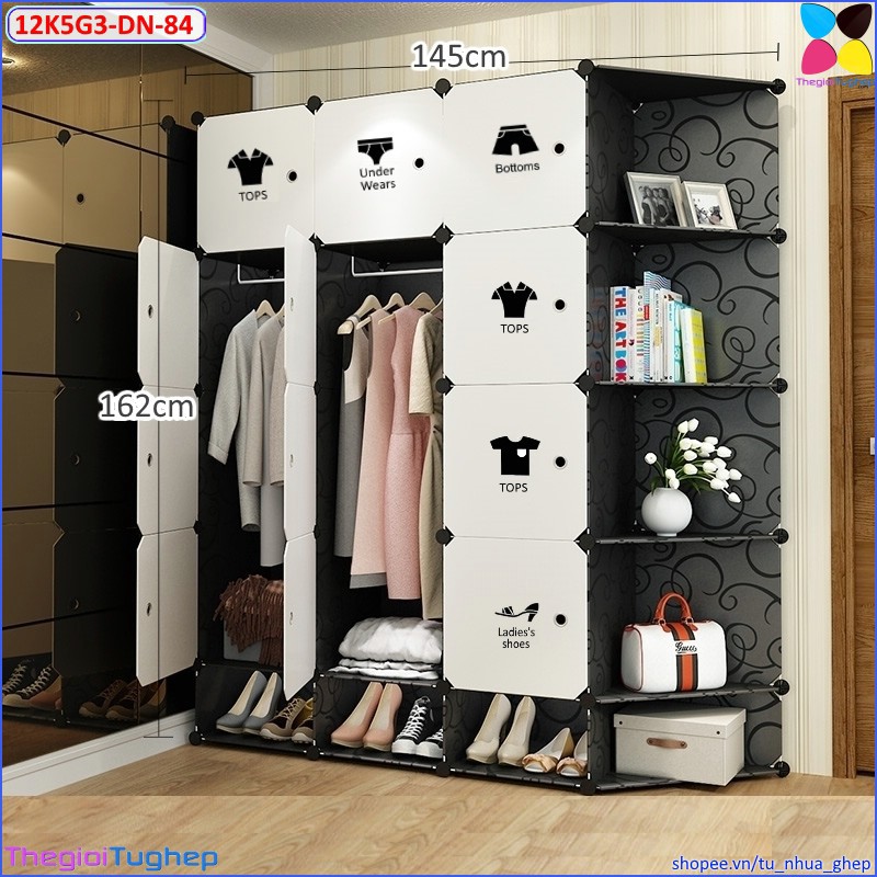 Nhà cửa & Đời sống > Nội thất > Tủ bếp || Tủ nhựa ghép 12 ô và 5 kệ góc và 3 ô giầy đa năng đen vân hình quần áo giày dép, sâu 47cm đủ đồ kèm thanh treoCòn hàng
