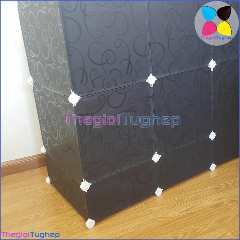 Tủ nhựa ghép 12 ô và 5 kệ góc và 3 ô giầy đa năng đen vân hình quần áo giày dép, sâu 47cm đủ đồ kèm thanh treo