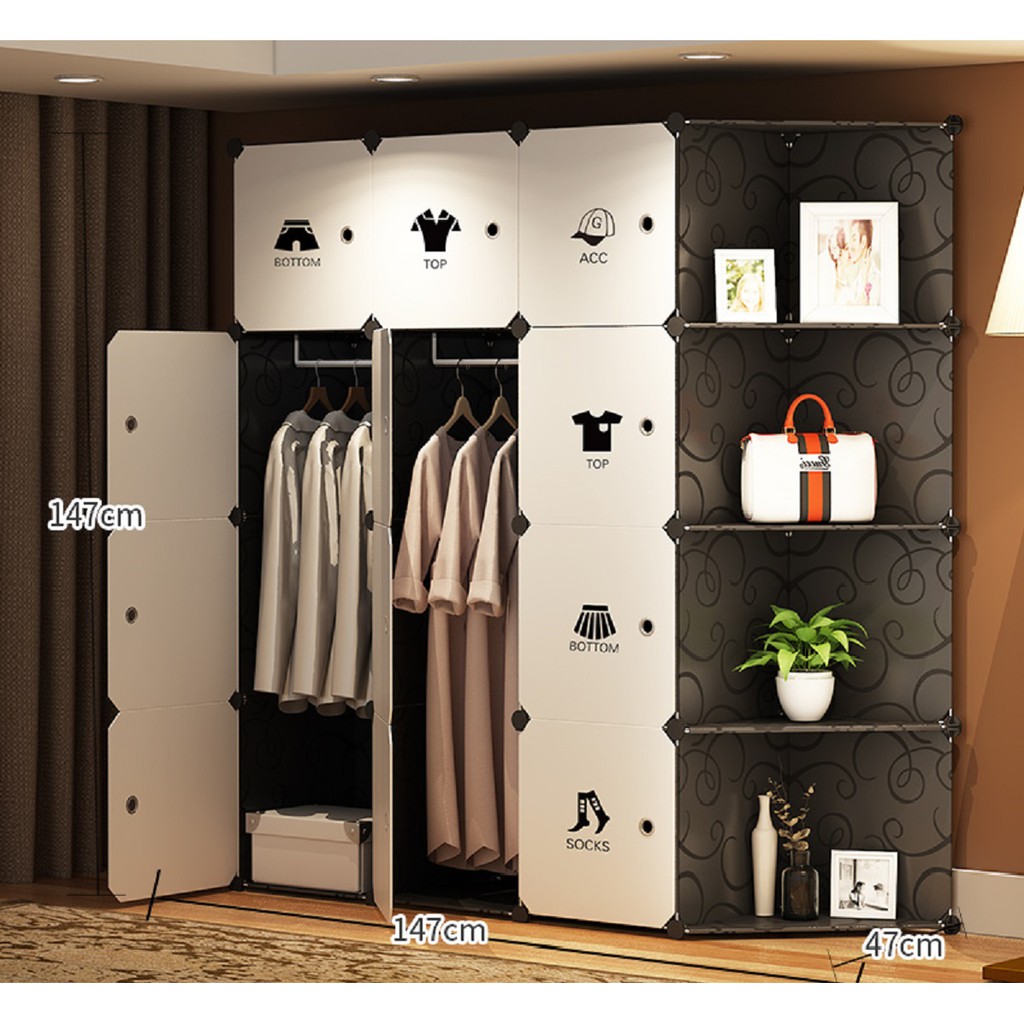 Kích thước tủ: Cao 148cm, rộng 148cm, sâu 47cmTủ gồm 12 ngăn tủ lớn, 4 ngăn xéo hở. Đầy đủ vách tủ, tặng 2 thanh treo đồ