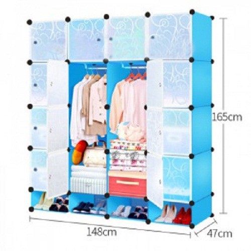 Tủ 16 ô và 4 ô giày có kích thước sâu 47cm, rộng 1m45, cao 1m6Kích thước mỗi ô tủ nhựa ghép sâu 47cm, rộng 37cm, cao 37cm