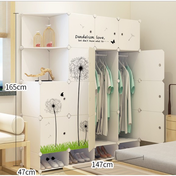 Kích thước tủ: Cao 165cm, rộng 148cm, sâu 47cmTủ gồm 16 ngăn lớn và 4 ngăn đựng giày