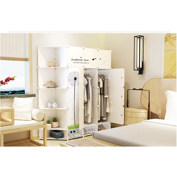 - Tủ gồm 12 ngăn tủ lớn, 5 ngăn tủ xéo hở kèm 3 ngăn đựng giày y hình, tặng 2 thanh treo đồ, ko dùng thanh treo vẫn đủ vách tủ