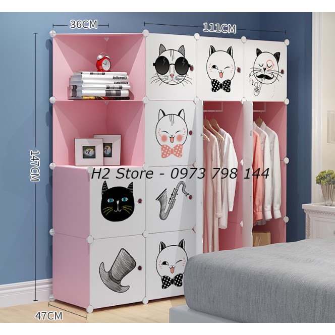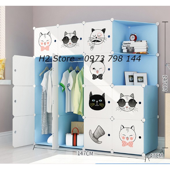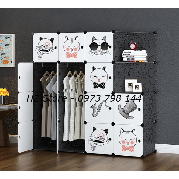 TỦ NHỰA GHÉP THÔNG MINH 16 Ô ( GỒM 2 KỆ GÓC ) CỬA HÌNH MÈO MŨ DỄ THƯƠNG ĐỂ ĐỒ ĐA NĂNG SÂU 47CM