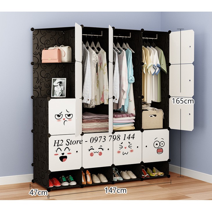 TỦ NHỰA LẮP GHÉP 16 Ô + 4 GIÀY (GỒM 2 KỆ GÓC) ĐEN CỬA TRẮNG MẶT CƯỜI ĐỂ ĐỒ ĐA NĂNG THÔNG MINH sâu 47cm