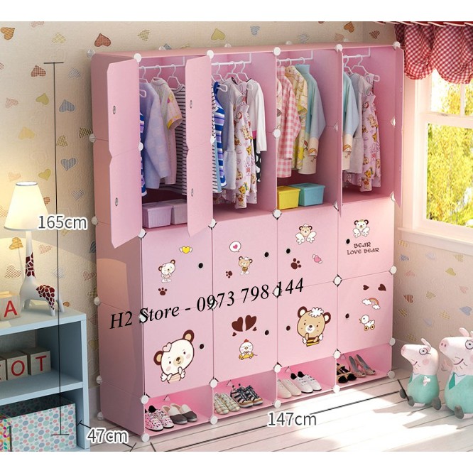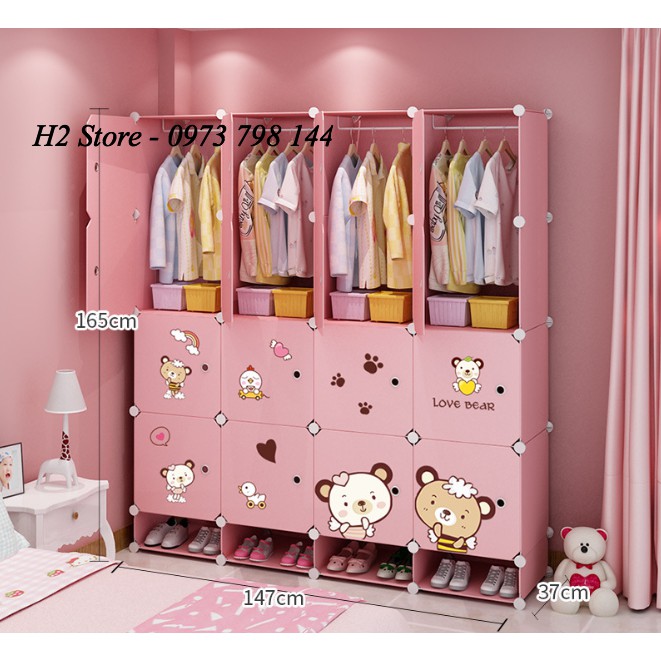 TỦ NHỰA LẮP GHÉP 16 Ô + 4 GIÀY CỬA GẤU DỄ THƯƠNG ĐỂ ĐỒ ĐA NĂNG THÔNG MINH sâu 47cm