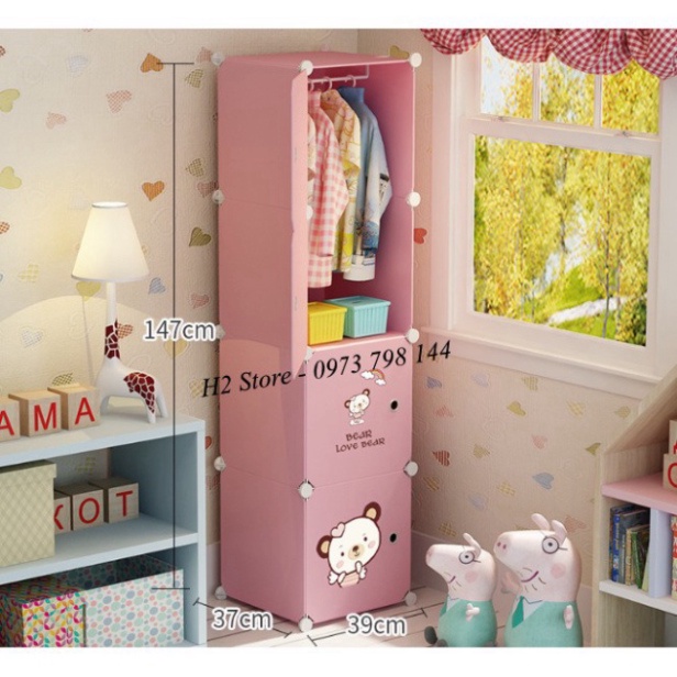 TỦ NHỰA LẮP GHÉP 4 Ô(4X1) HỒNG NHẠT CỬA TRẮNG GẤU ĐỂ ĐỒ ĐA NĂNG THÔNG MINH CHO BÉ sâu 47cm