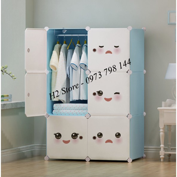 TỦ NHỰA LẮP GHÉP 6 Ô XANH DƯƠNG NHẠT CỬA TRẮNG MẶT CƯỜI ĐỂ ĐỒ ĐA NĂNG THÔNG MINH