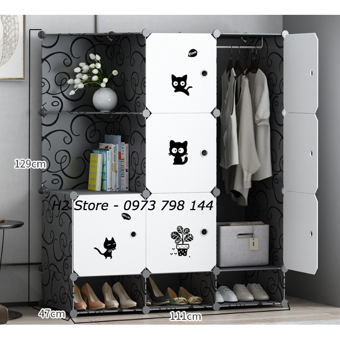 TỦ NHỰA LẮP GHÉP 9 Ô + 3 Ô GIÀY (GỒM 2 KỆ GÓC) ĐEN CỬA TRẮNG MÈO ĐEN ĐỂ QUẦN ÁO ĐA NĂNG