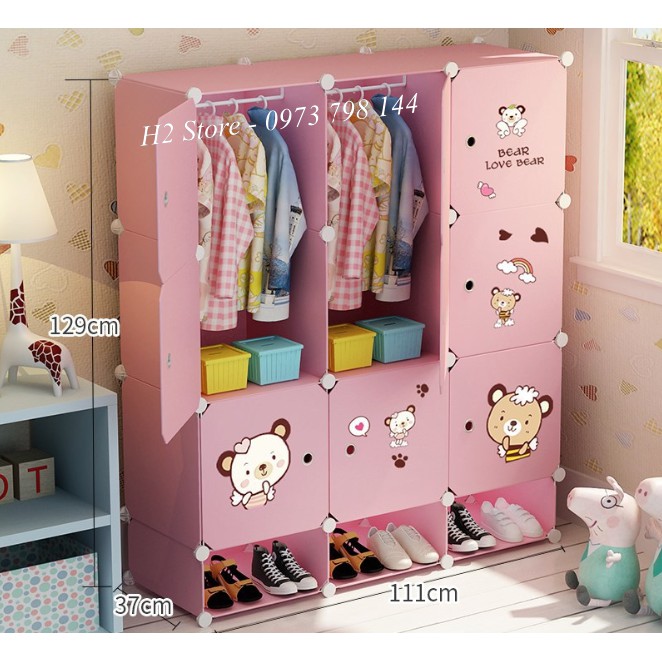 TỦ NHỰA LẮP GHÉP 9 Ô + 3 Ô GIÀY MÀU HỒNG CỬA ĐỤC GẤU ĐA NĂNG THÔNG MINH sâu 47cm