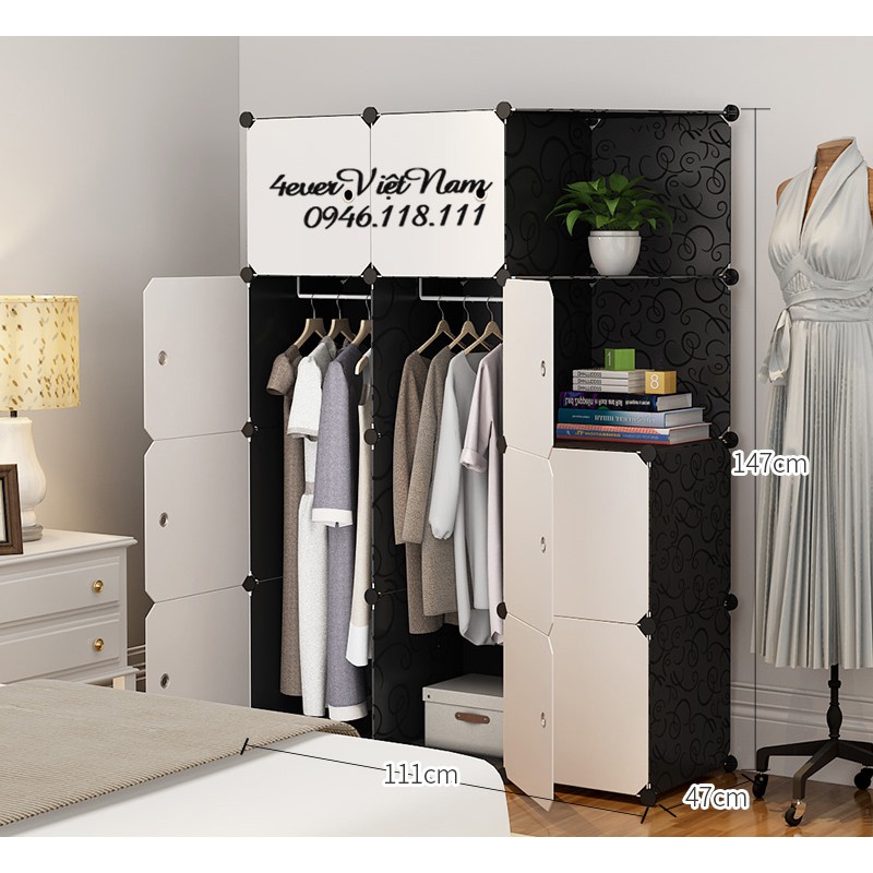 Tủ nhựa lắp ghép đa năng 12 ô sâu 47,màu đen, cửa trắng, 2 treo, 2 xéo - Bảo hành 1 năm