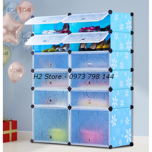 TỦ NHỰA LẮP GHÉP ĐA NĂNG 2 Ô TO ĐỂ BOOT + 10 Ô ĐỂ GIÀY DÉP MÀU XANH DƯƠNG HOA CỬA TRẮNG TRONG SIZE TO