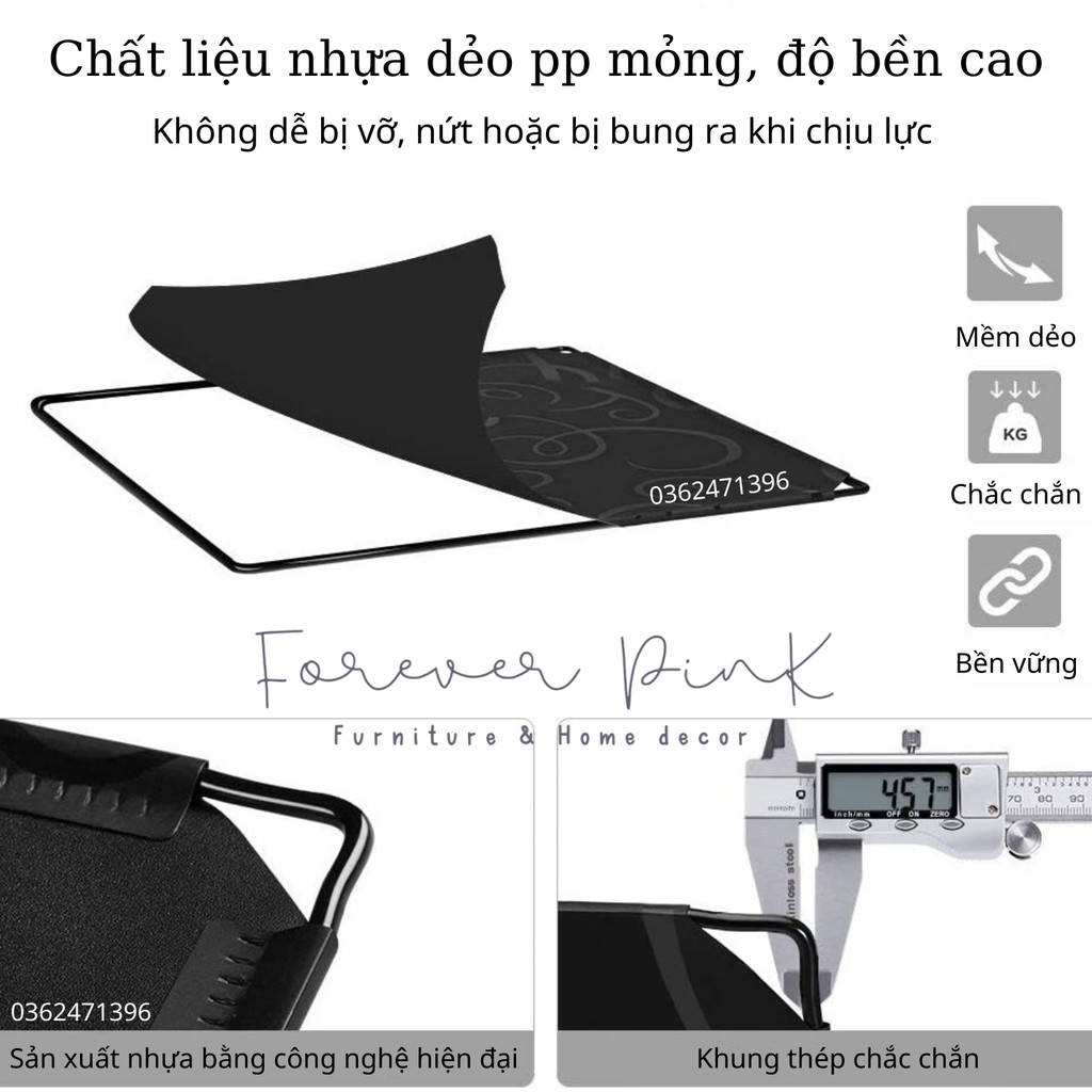 Tấm nhựa được làm từ nhựa PP (PolyPropylen) an toàn cho người sử dụng và môi trường. Tấm nhựa có chiều dày từ 0.35-0.4mm. Xung quanh tấm nhựa có khung bằng thép, đường kính thanh thép 4mm. Các khung thép liên kết với nhau tại các góc bằng các chốt nhựa để tạo thành khung 3 chiều rất chắc chắn.