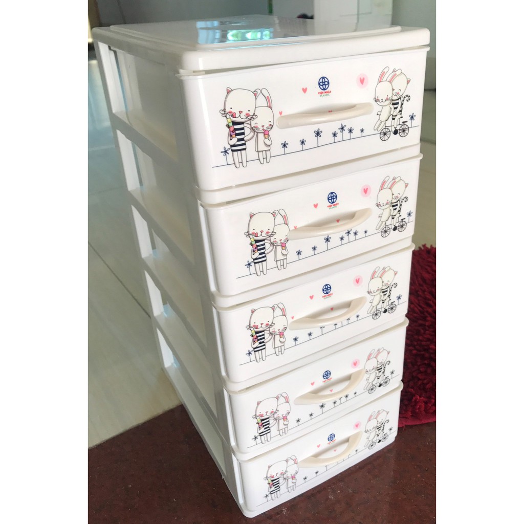 - Kích thước 5 tầng : rộng18.3cm x sâu 28cm ( tính cả tay cầm ) x cao 40.5cm.- Màu sắc: trắng, hồng.
