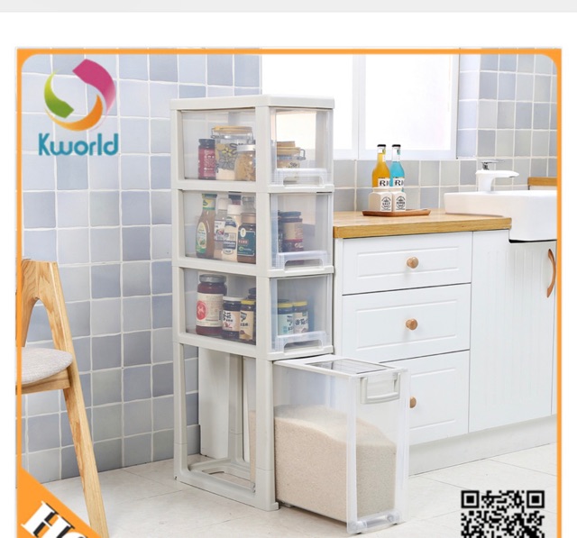 Nhà bếp có ngăn đựng gạo,để chai lọ như mắm muối mì chính tủ có 4 bánh xe giúp cho việc gi chuyển nhẹ nhàng