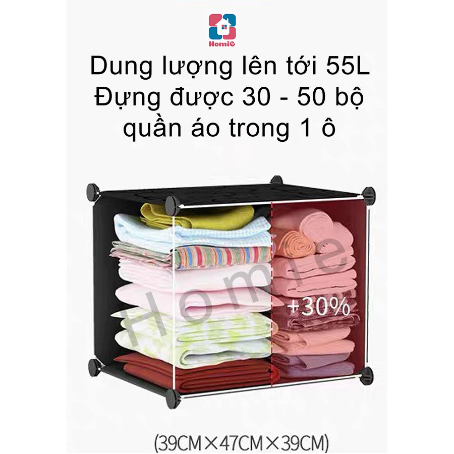 2. ĐỰNG RẤT NHIỀU, SỨC CHỨA LỚN LÊN ĐẾN 15KG MỘT Ô (trong khi quần áo của bạn chứa đầy cả ngăn tủ MAX 5kg – 7kg). Không gian được tối ưu, chia cách bằng các ô riêng biệt. Khoang treo quần áo treo được từ 20-25 bộ. Với chiếc tủ 8 ô Homie, bạn có thể chứa khối lượng đồ lên đến 90kg, quá tuyệt !