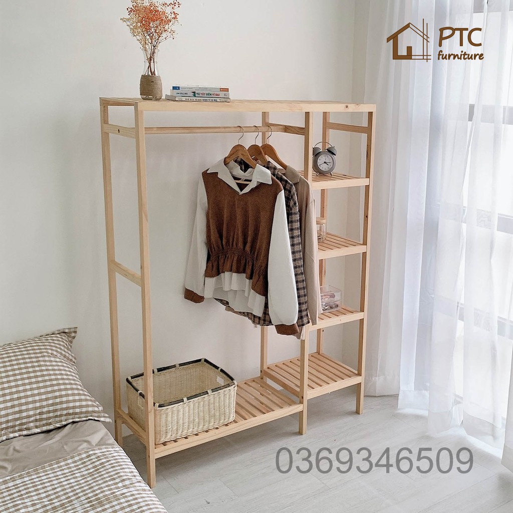 Tủ Quần Áo FREESHIP Giá Treo Quần Áo Phong Cách Hàn Quốc Gỗ Thông Tự Nhiên 2 Buồng