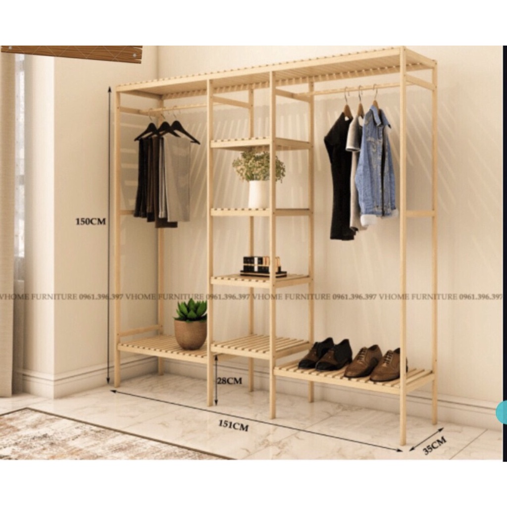 Tủ Quần Áo, Giá Treo Quần Áo Gỗ Thông 3 Gian Phong Cách Hàn Quốc Kệ Gỗ Thông Nhập KhẩuTHÔNG SỐ: