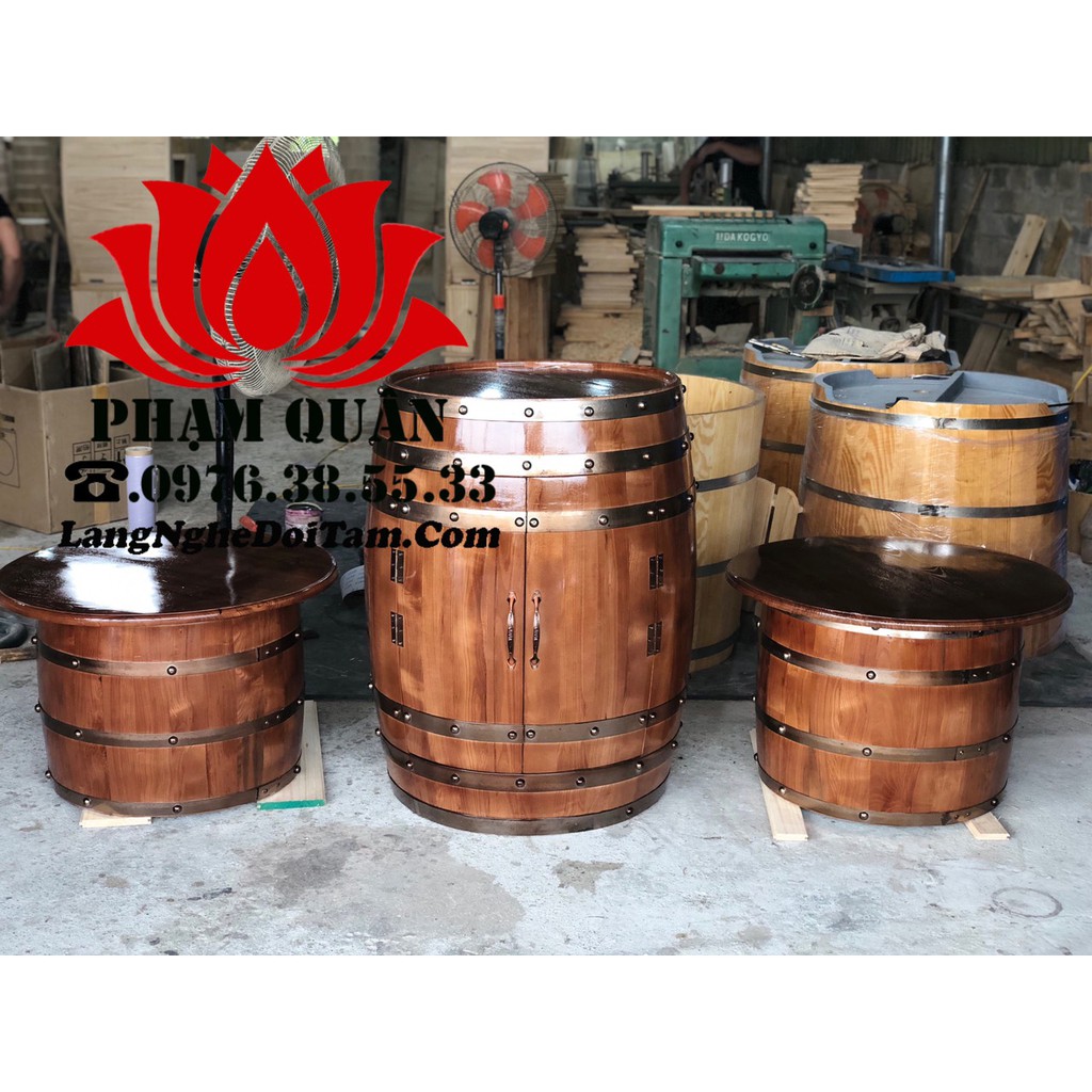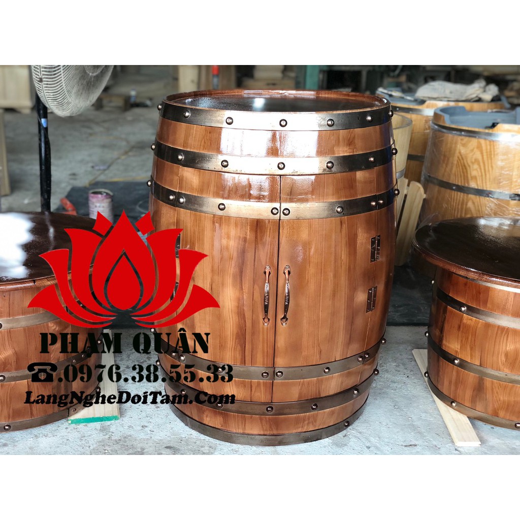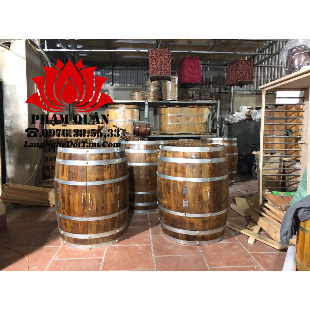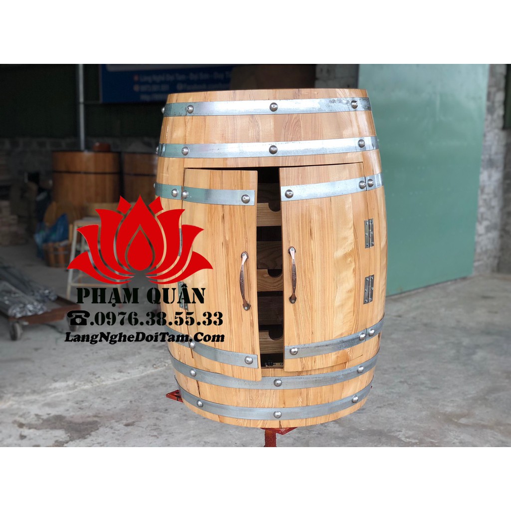 Tủ ruou thùng gỗ sồi trang trí:- Chất liệu: gồ sồi sấy nhập khẩu, đai tôn mạ kẽm không gỉ.