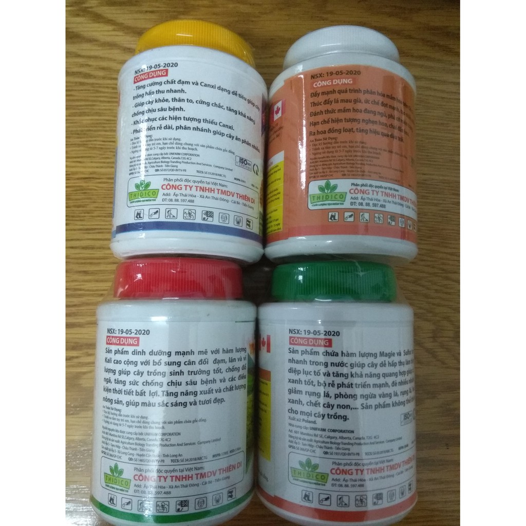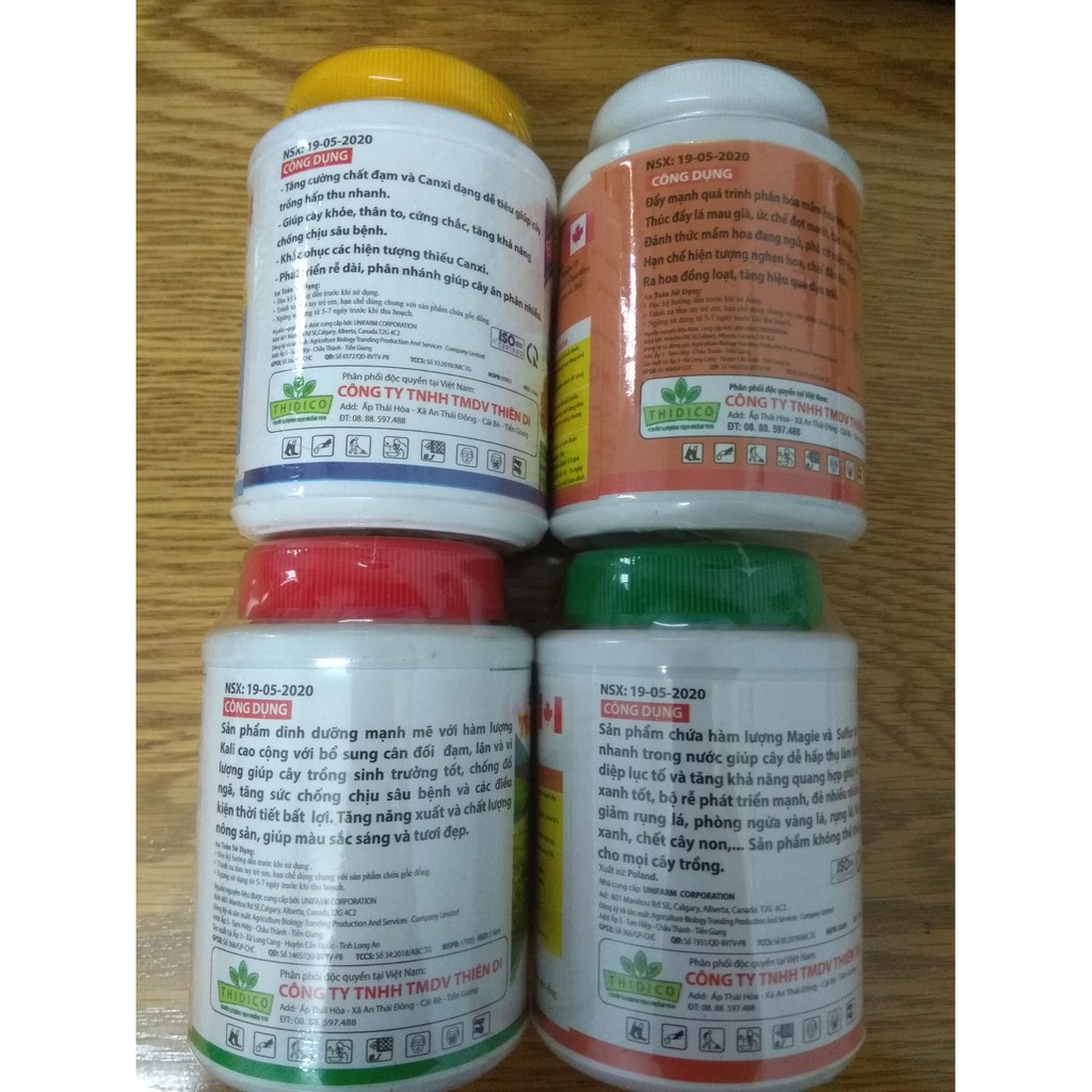 Giới thiệu Bộ tứ sản phẩm dưỡng cây, kích hoa ( Canxi, Kali, Magie, siêu lân ) 100 gram/chai
