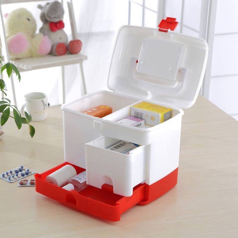 - Ngăn lớn và cao có thể đựng các lọ siro, lọ thuốc nước. Ngăn nhỏ hơn dùng đựng thuốc dạng vỉ, thuốc viên. Ngoài ra, hộp có thêm ngăn kéo dùng đựng các dụng cụ khác như kéo, bông tai, bông gạc, dầu gió, nhíp, đèn soi tai....