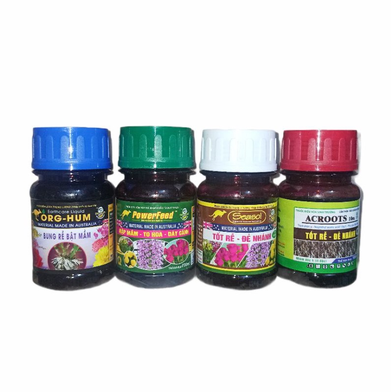 Bộ 4 món dinh dưỡng toàn diện cho cây từ giai đoạn nhỏ đến trưởng thành cho hoa, kết trái, mỗi chai 100ml có hướng dẫn rõ ràng trên vỏ hộp.