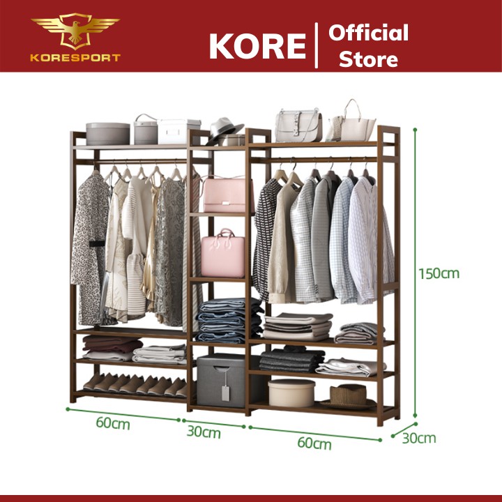 Tủ treo quần áo bằng tre 3 ngăn 150x30x150cm kệ tre có thanh phơi quần áo nhiều lớp lưu trữ