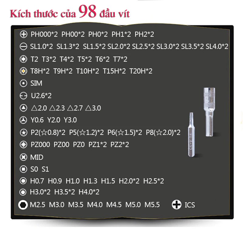 ● Nó bao gồm 98 loại bit tuốc nơ vít trong một bộ tuốc nơ vít, đáp ứng các nhu cầu khác nhau của bạn.