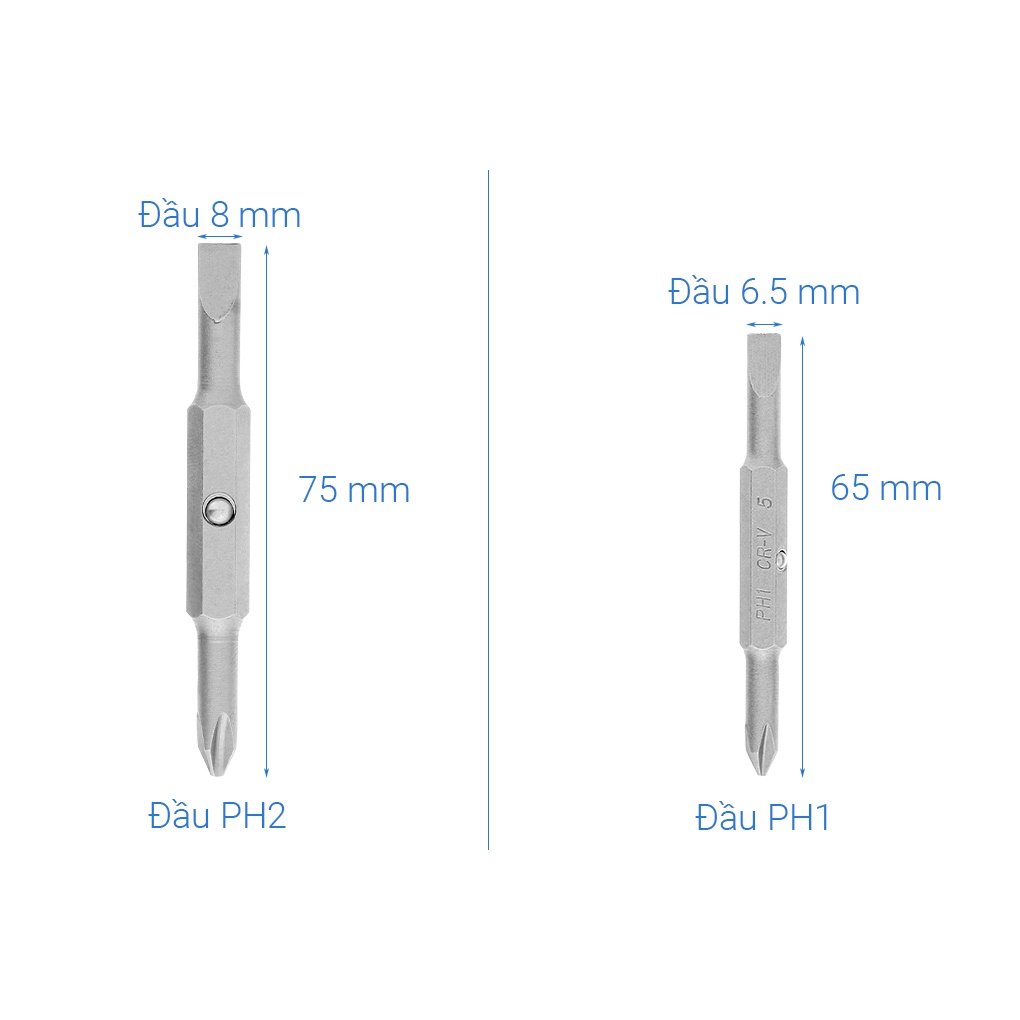 • Vít 2 chiều có kích thước 6.35 x 65mm và quy cách đầu vít là PH1 + SL5.• Vít 2 chiều có kích thước 8 x 75mm và quy cách đầu vít là PH2 + SL6.