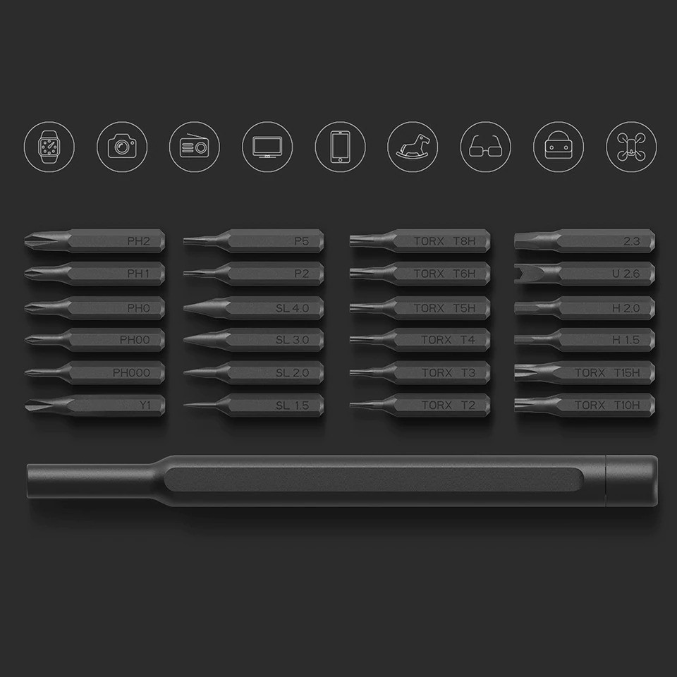 ✔ Bao gồm 24 đầu tua vít với kích cỡ, kiểu dáng khác nhau - cho nhiều mục đích khác nhau như sửa cửa, đồ chơi, điện thoại, máy tính hay bất cứ đồ dùng gia dụng nào.