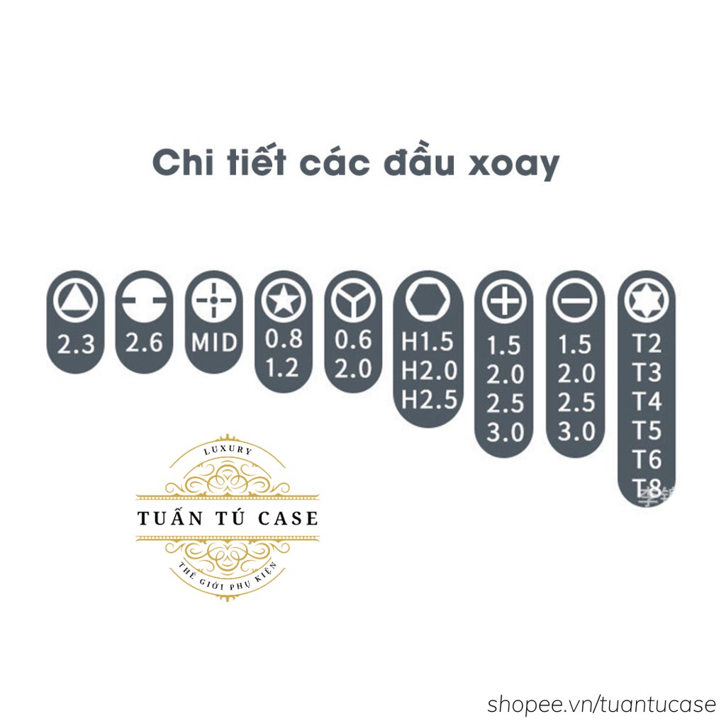 - Bao gồm 1 đầu mẹ và 24 đầu vít đầy đủ các dạng đầu như dẹt, 2 lỗ, tam giác, lục giác, các loại đầu từ 3 đến 6 cạnh…