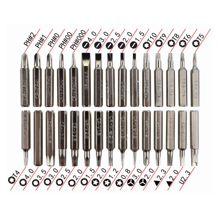 - Bộ sản phẩm gồm với đầy đủ các dạng đầu và kích cỡ: dẹt, tam giác, lục giác, hay các đầu từ 3 đến 6 cạnh.