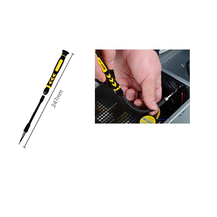 Bộ sản phẩm gồm đầy đủ các dạng đầu như dẹt, 2 lỗ, tam giác, lục giác, các loại đầu từ 3 đến 6 cạnh. Mỗi dạng đầu gồm nhiều kích thước khác nhau, đảm bảo mở được tất cả các linh kiện. Đầu vít có nam châm giúp dính các đinh ốc mà không sợ bị rơi mất khi tháo ra hay lắp vào.