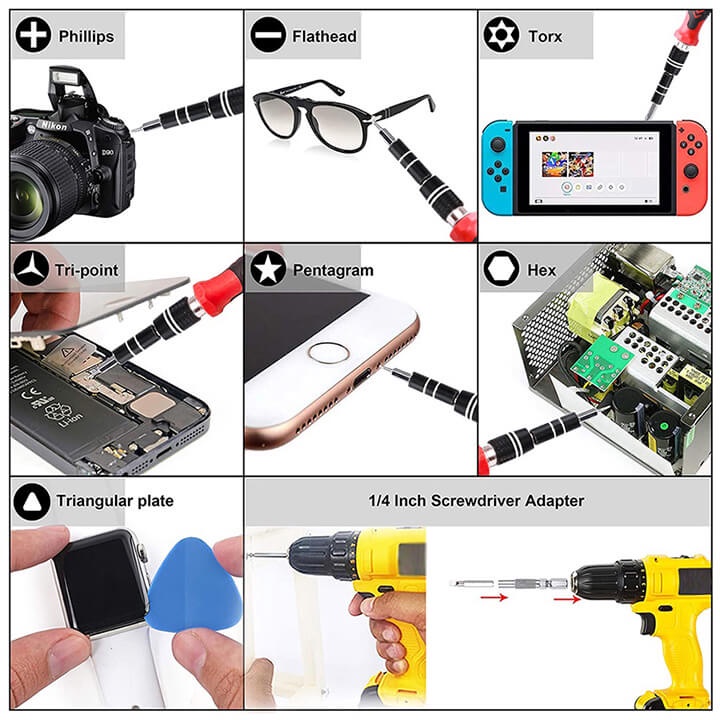 - Bộ tua vít này được sản xuất để sửa chữa và bảo trì các sản phẩm điện tử và dụng cụ chính xác như điện thoại di động, đồng hồ và thiết bị gia dụng.