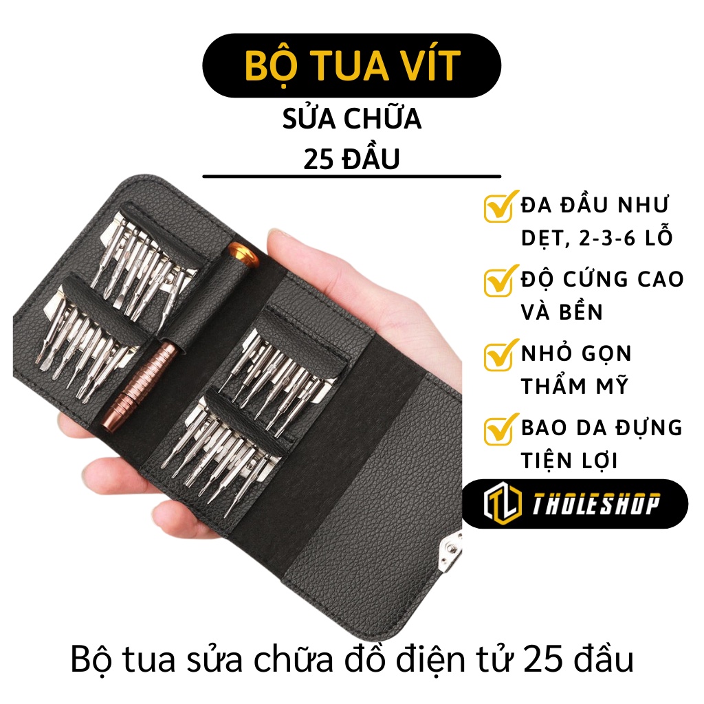 + Bộ tua vít ví da sửa chữa đồ điện tử 25 đầu siêu tiện ích, 25 chi tiết : 24 đầu tua vít + 1 thân lắp đầu tua vít, Bao da có kích thước nhỏ gọn, rất vừa túi và chuyên nghiệp.