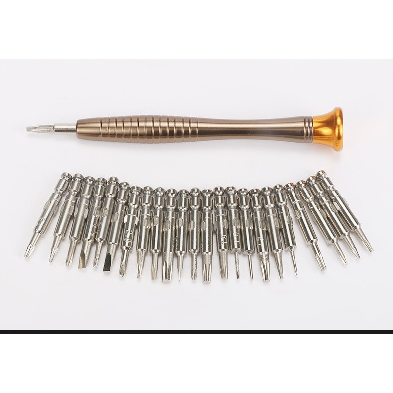 - Bộ tua vít ví da sửa chữa đồ điện tử 25 đầu với sự tiện lợi của nó chắc chắn hỗ trợ cho bạn rất nhiều trong công việc sửa chữa đặc biệt cac đồ linh kiện điện tử được thiết kế nhỏ như đồng hồ, điện thoại, máy ảnh...v.v. Các đầu tua vít được gia công bằng loại thép hóa có độ bền cao, chống gỉ sét. Có thể dùng để mở các loại vít: đầu dẹt, tam giác, lục giác, 3 cạnh, 4 cạnh, 5 cạnh và 6 cạnh, mỗi dạng đều có đủ các cỡ từ lớn đến nhỏ có thể thay đổi dễ dàng.