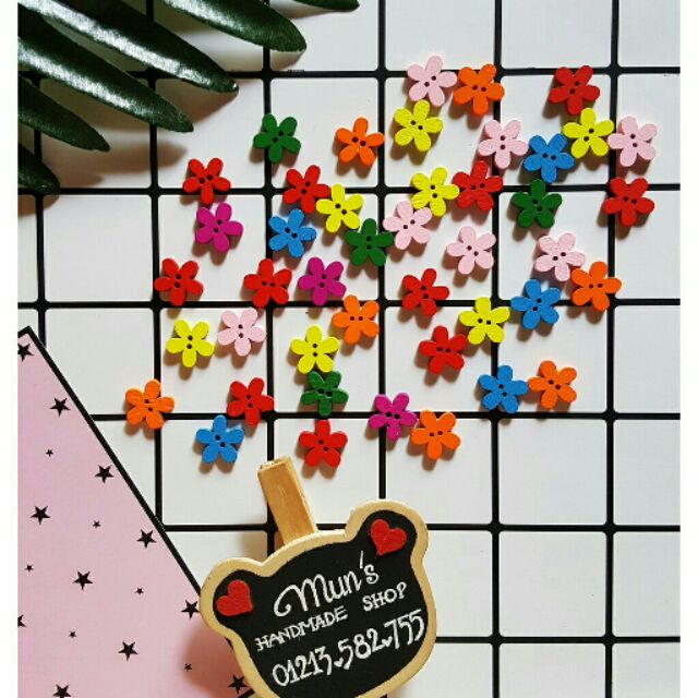 Sở thích & Sưu tầm > Dụng Cụ May Vá || Túi 10 nút gỗ bông hoa 5 cánh đủ màu sắc trang trí thiệp, sổ, scrapbook, album ảnhCòn hàng