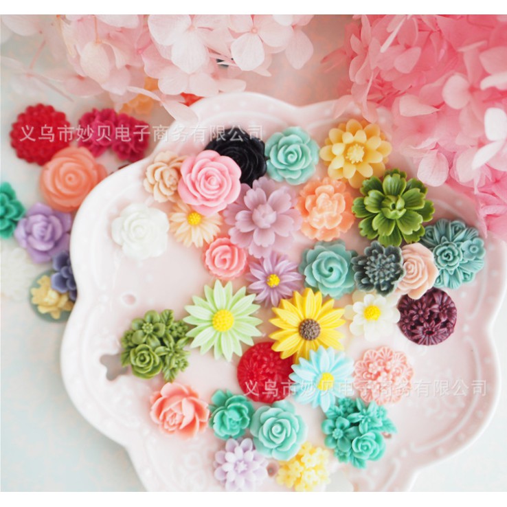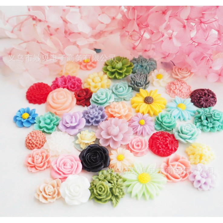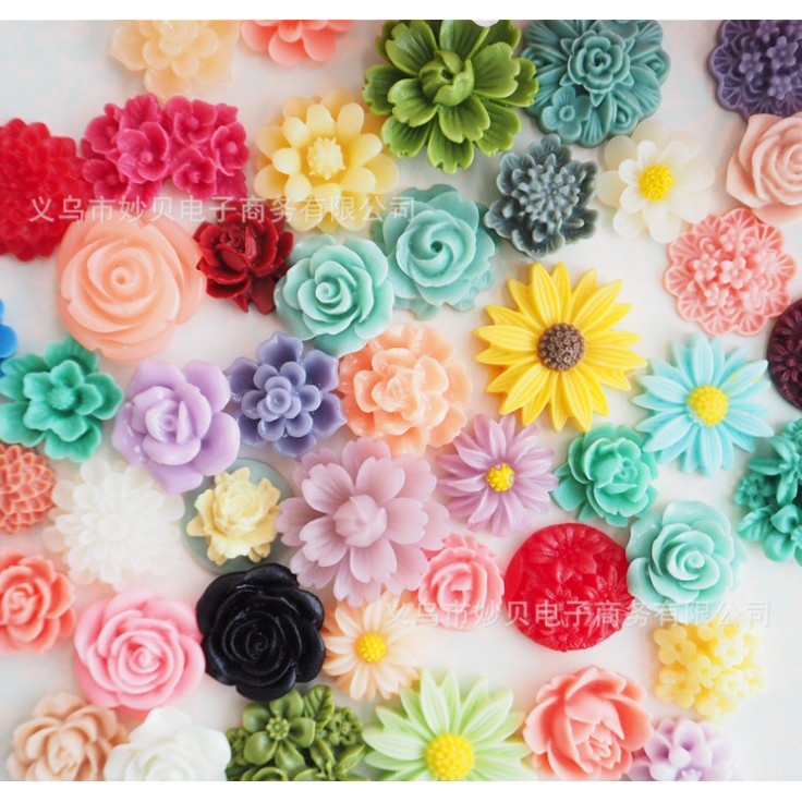 Sản phẩm là các mô hình các mẫu hoa trang trí móc chìa khóa, kẹp tóc, dán ốp điện thoại...Kích thước : 18 - 30mm